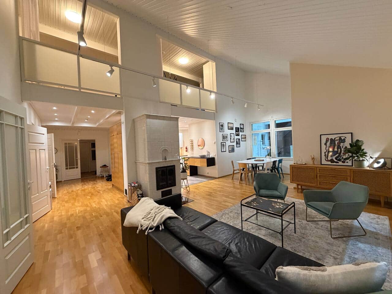 • Fireplace + warm Scandinavian design